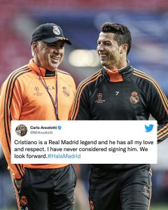 وكتب أنشيلوتي، على حسابه الرسمي بموقع التواصل الاجتماعي “تويتر“: “كريستيانو رونالدو أحد أساطير ريال مدريد ولديه كل حبي واحترامي، لكنني لم أطلب أو أخطط للتوقيع معه.. نحن نتطلع إلى الخطوة التالية في طريقنا”.