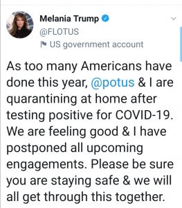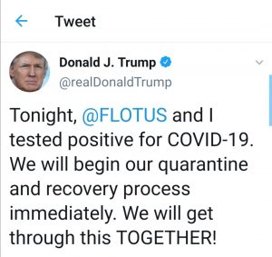 وكتب ترامب: “الليلة، ثبتت إصابتي أنا وميلانيا(زوجته) بكوفيد 19 وسنبدأ الخضوع للحجر الصحي والتعافي على الفور. وسنجتاز هذا الأمر معا!”.