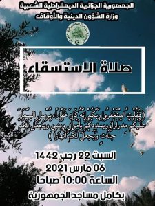 كشفت وزارة الشؤون الدينية والأوقاف مساء اليوم الإثنين ،أنه سيتم يوم السبت المقبل إقامة صلاة الإستسقاء الموافق ل 22رجب 1422 الموافق ل 6مارس 2021 عبر كامل مساجد التراب الوطني.