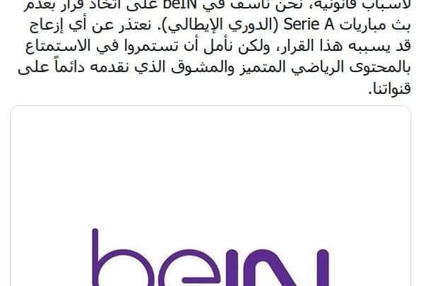 في قرار صادم ومفاجئ، أعلن مجمع قنوات بيين سبورتس القطرية عن إعتذاره من متابعيه على عدم نقل مباريات الكالتشيو لأسباب قانونية ،وهذا مايُفسَّر على أن القنوات العملاقة فقدت حقوق بث أحد أكبر الدوريات في العالم، والأكيد أن القرار سيثير الكثير من الجدل في أوساط المتابعين في شمال إفريقيا والشرق الأوسط وسيضع عدة علامات إستفهام، أين سيشهاد الجمهور الكالتشيو، ولصالح من فقدت القنوات حقوق البث ؟؟