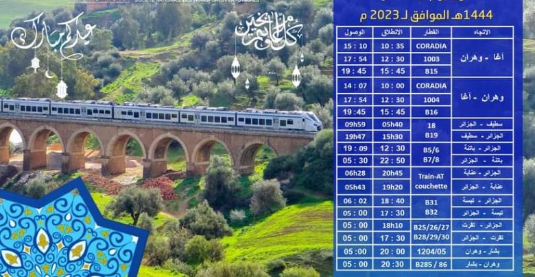 أعلنت الشركة الوطنية للنقل بالسكك الحديدية ، برنامجا خاصا لحركة سير القطارات تحسبا لعيد الفطر . وقد أفاد بيان للشركة يوم الخميس ، على أنه لأجل تمكين المسافرين من الإلتحاق بذويهم ، تم الأخذ بعين الإعتبار في هذا البرنامج تنقل المسافرين قبيل عيد الفطر و أول يوم عيد الفطر , على أن تعود حركة السير عادية حسب البرنامج اليومي إبتداء من ثاني يوم من أيام عيد الفطر .
