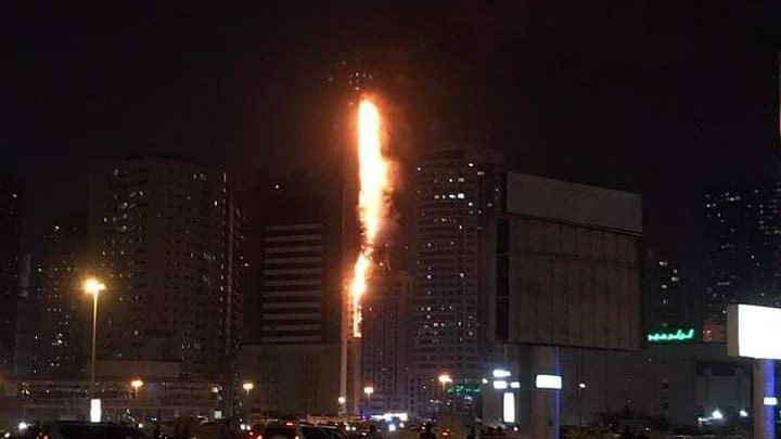 نشوب حريق بأحد الأبراج السكنية بالشارقة الإمارات و فرق الدفاع المدني تسيطر على الوضع